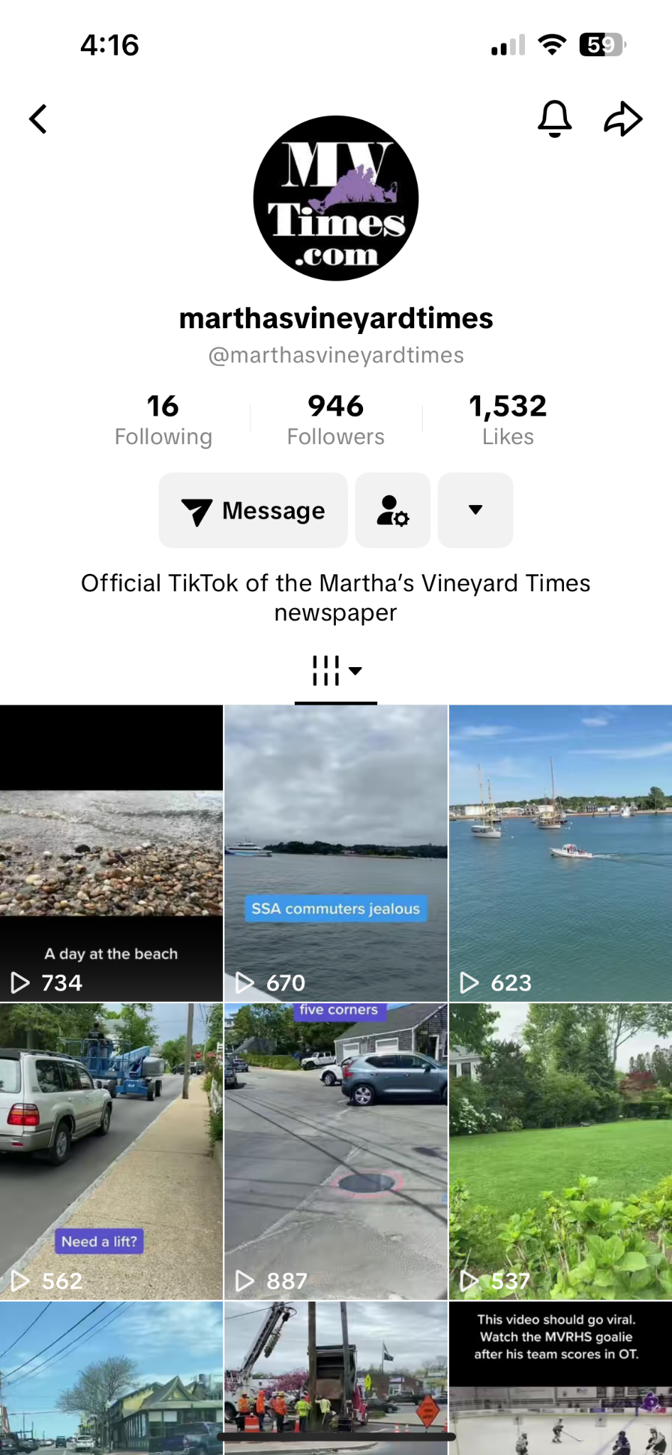 At The Martha's Vineyard Times, I extended those skills into digital media by creating and managing a TikTok account for the paper. From brainstorming concepts to editing content, I developed strategies that translated traditional journalism into short-form video built for discovery and reach. That experience showed me how local news can meet readers where they are, and how new platforms can bring a community closer together.